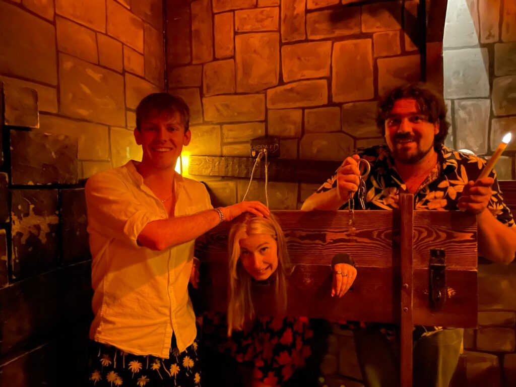 Op z’n Pools (= een manier van binnengaan die bijna bij iedere escape room in Wrocław gebruikt wordt, maar die ik niet spoilerfree kan toelichten) mochten we de kamer betreden. Het verhaal is mega eenvoudig: Over een uur worden we door de beul afgeslacht. Dat willen we natuurlijk niet, dus we moeten ontsnappen uit deze middeleeuwse dodencel. Het thema ‘middeleeuwen’ en ‘martelkamer’ had ik niet verwacht bij de naam Death Penalty, dus dat zorgde voor een verrassing toen we eenmaal in de kamer waren.